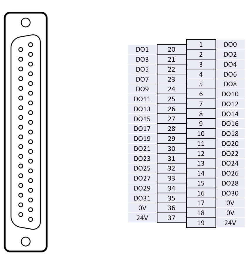 模組介紹cPCI 32ch-DO本頁導覽cPCI 32ch-DO 1. 簡介 cPCI 32ch-DO 是一張具備 32 通道輸出的 24V 工業隔離數位 I/O 卡。 2. 特色 通道數:32 通道輸出 隔離:24V 工業隔離 連接器:D-SUB 37P 最大輸出電流:每個 PIN 腳最大輸出電流為 350mA。 3. 外觀與腳位 警告Pin37 & Pin19 需要24V電壓輸入。
