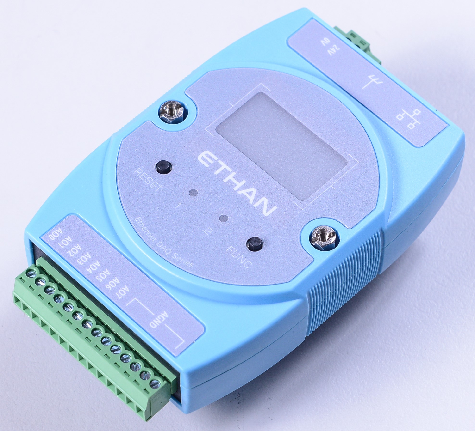 Ethernet-DAQ 使用說明書Ethan 產品型號Ethan-O本頁導覽Ethan-OEthan-O 提供 8 通道 16-bit 類比輸出(±10V),更新率達 1kHz,支援任意波形產生功能,適用於訊號模擬與控制應用。 產品外觀 主要特色 電源輸入: 24VDC 10/100 Base-T 乙太網路介面 類比輸出 (AO): 8 通道同步輸出 & 16-bit 單端解析度 輸出範圍: ±10V 最大更新率: 1kHz 支援波形產生功能 支援 Python, C#, 以及 LabVIEW 腳位定義