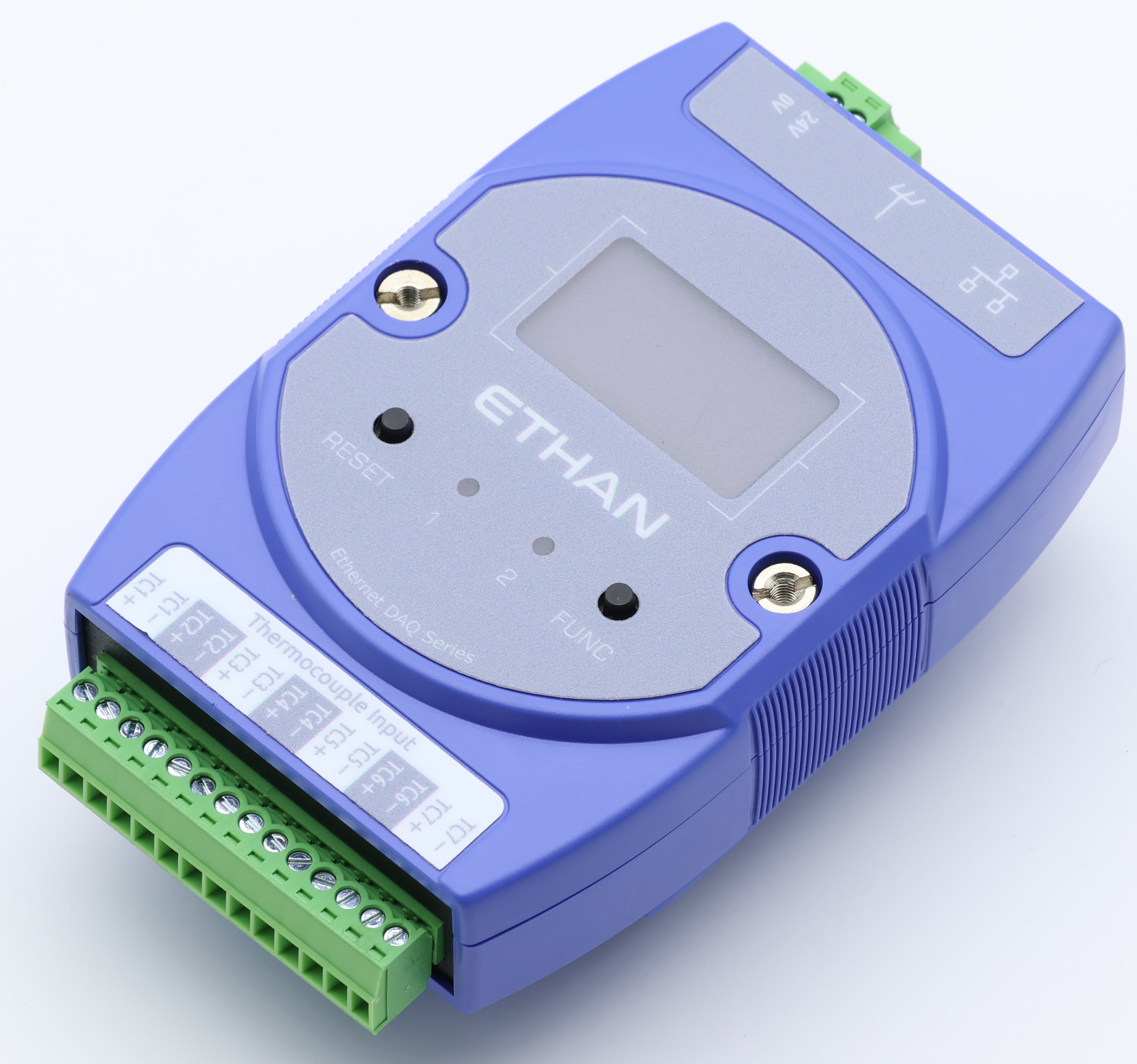 Ethernet-DAQ 使用說明書Ethan 產品型號Ethan-T本頁導覽Ethan-TEthan-T 專為溫度量測設計,提供 7 通道熱電偶輸入,支援 K, J, N, R, S, T, E, B 八種熱電偶型號,量測範圍 -210°C ~ 1800°C,內建冷接點補償。 產品外觀 主要特色 電源輸入: 24VDC 10/100 Base-T 乙太網路介面 7 通道熱電偶輸入 支援感測器類型: K, J, N, R, S, T, E, & B 型 穩定時間: 160ms (單通道) 支援 Python, C#, 以及 LabVIEW 腳位定義