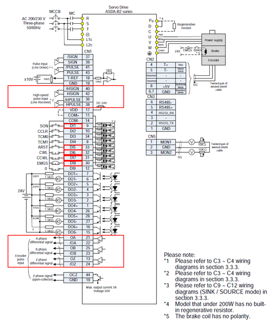 以下提供主流伺服驅動器的標準接線範例。 圖中 紅色框線 標示處為必須連接至軸卡的重要 I/O 訊號點。