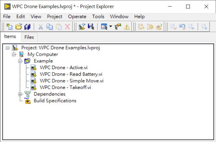 | WPC Drone - Simple Move.vi | 完整的無人機移動流程 (包含模式設定 → 啟動無人機 → 起飛 → 移動 → 降落) |