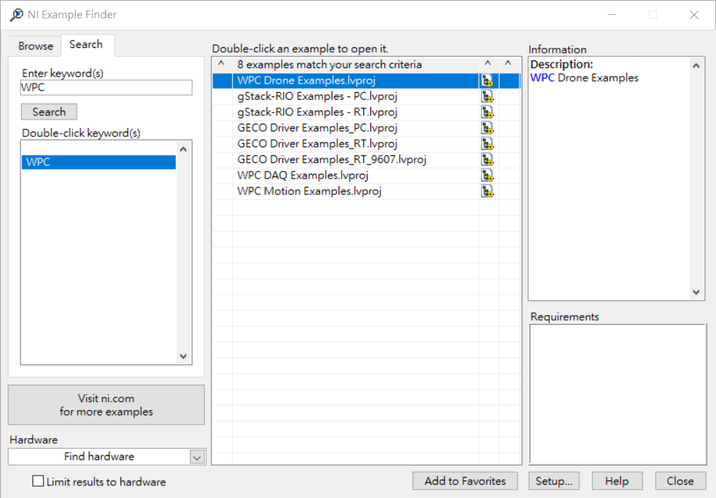 WPC。 - 點擊搜尋按鈕,您將會看到所有適用於 LabVIEW 且與 WPC 產品相關的範例程式。