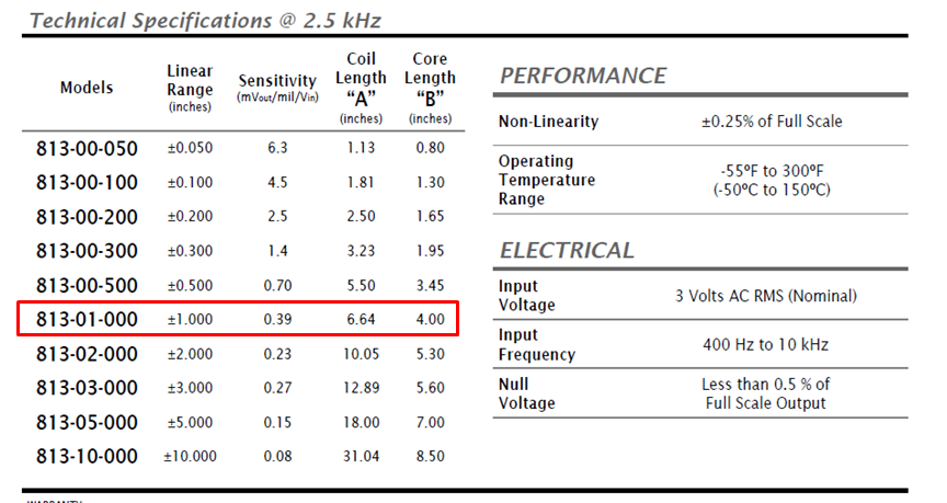 本模組可完美搭配 LVDT-813 系列位移感測器使用,下圖展示了該系列的典型規格與性能曲線。