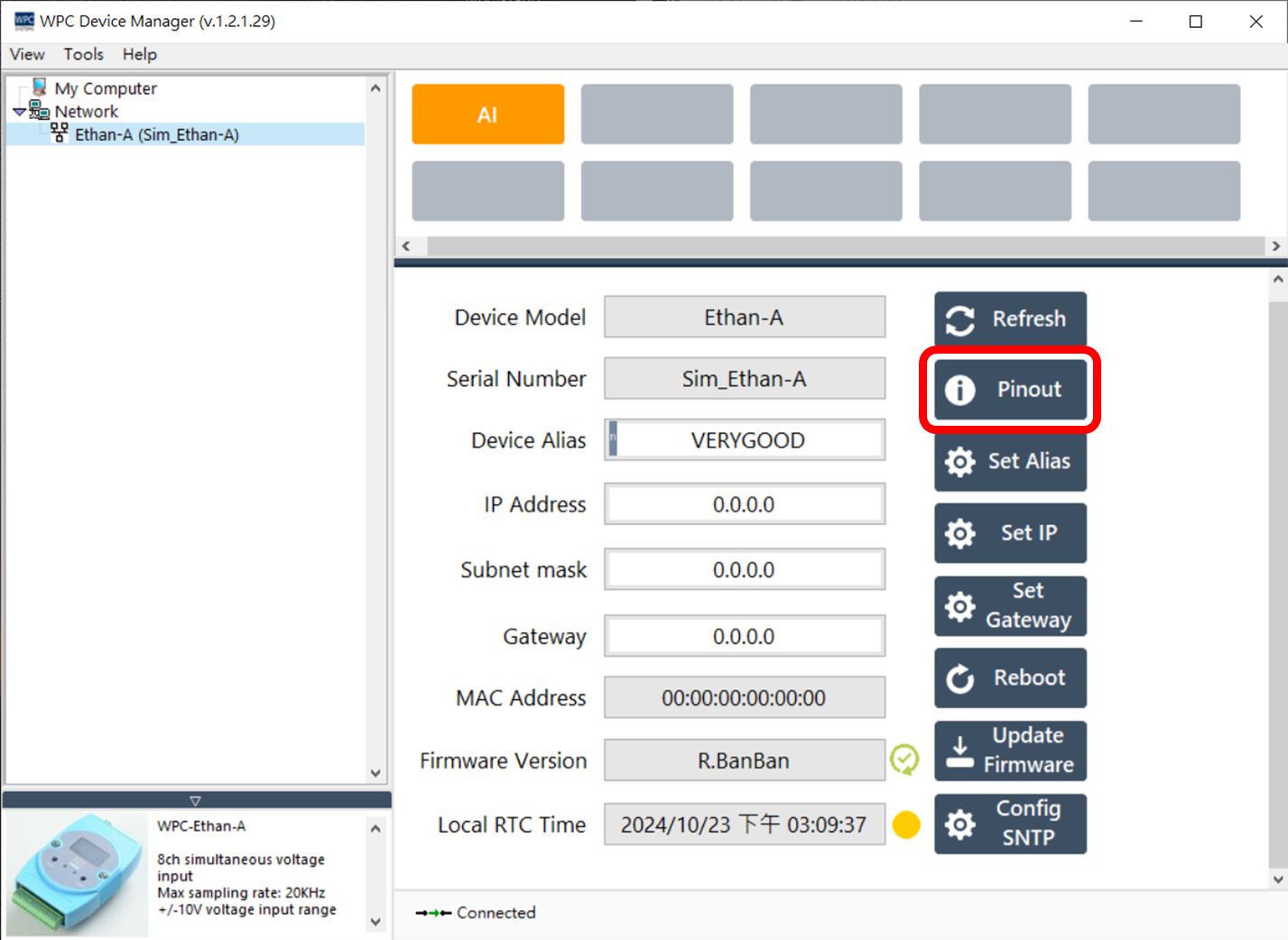 點擊 "Pinout" 按鈕以顯示腳位圖。視窗大小可根據使用者需求調整