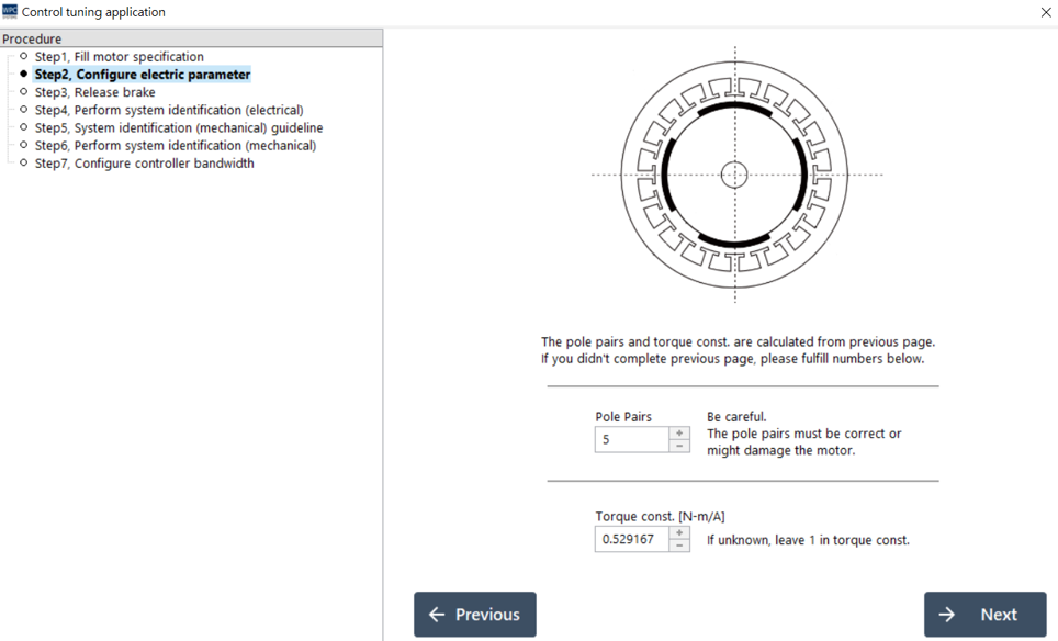 顯示馬達的詳細電氣參數 (如相電阻、相電感)。若上一步驟已正確選擇型號,此處通常不需修改,點擊 Next 繼續。