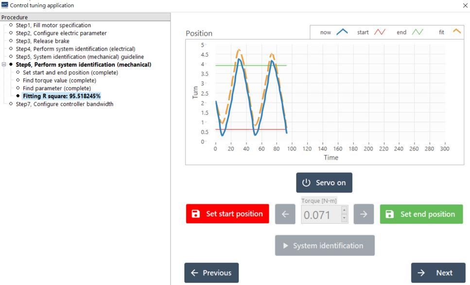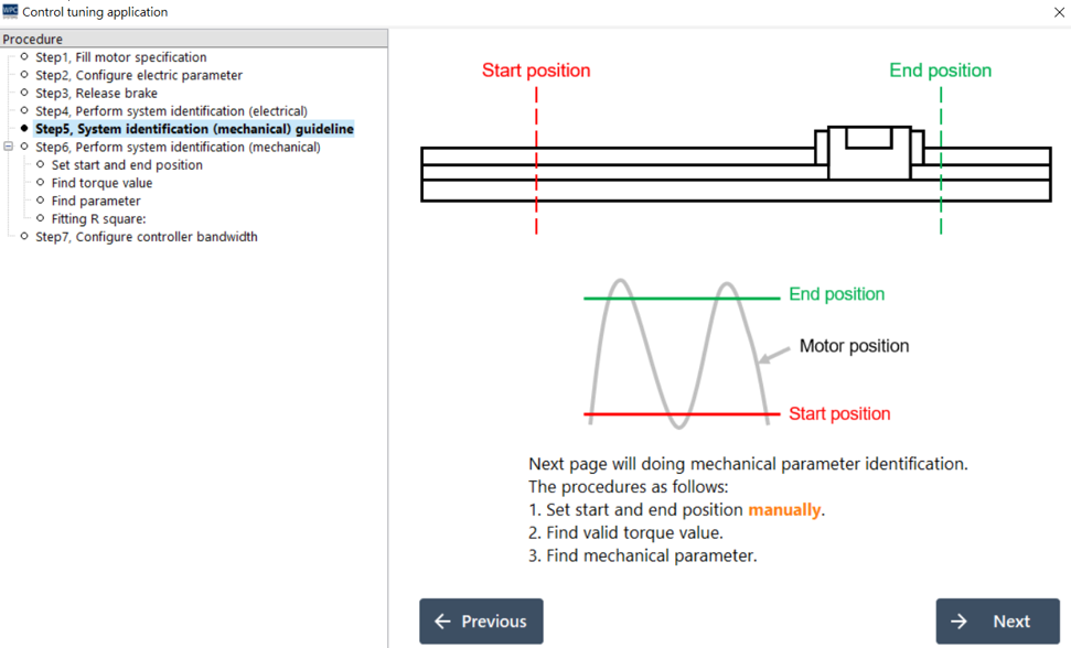 - 馬達將在起始點與結束點之間往返測試,並自動調整輸出。