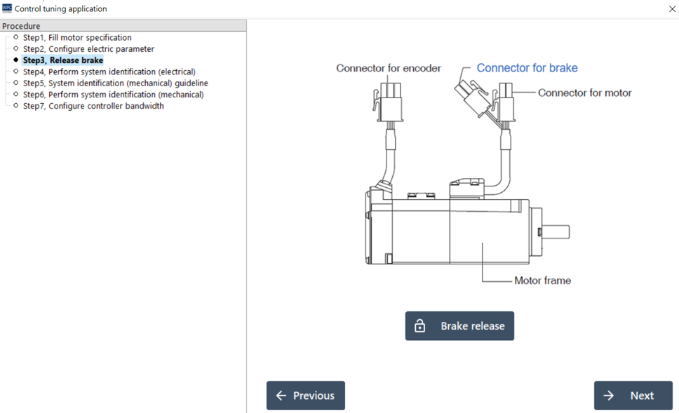 若您的馬達配有煞車 (Brake) 機構,請依照指示解除煞車,以確保馬達軸心可自由轉動。詳細接線請參閱 WPC-EDrive-SRV 硬體使用手冊。