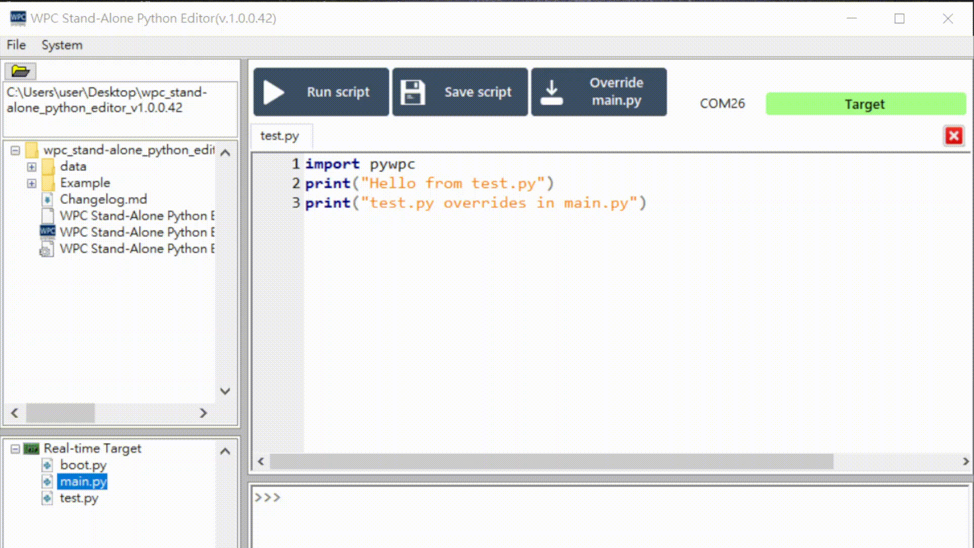 在 Editor 中撰寫或開啟 main.py 程式碼。完成後,點擊 "Run script" 按鈕以執行程式碼,結果將顯示在 Console 中。