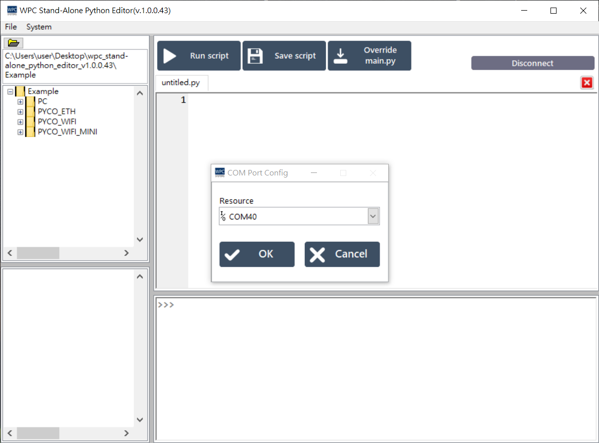 首次開啟 Stand-Alone Python Editor 時,它將會嘗試連接 COM Port。