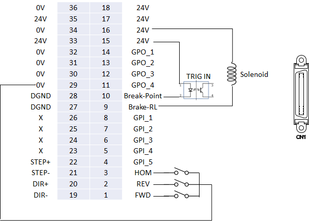 | 7 | I/O connector (CN1, 36P) | Digital I/O interface, including limit switches (FWD/REV), brake release (Brake), and break-point signals. |