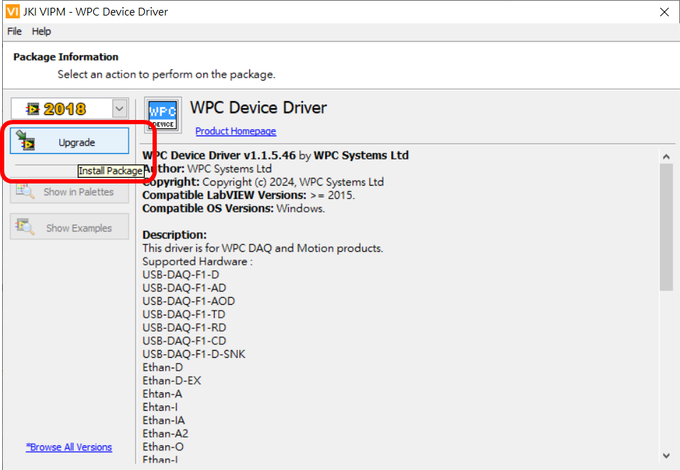 Click "Install" or "Upgrade" to install the latest version of the WPC Device Driver.