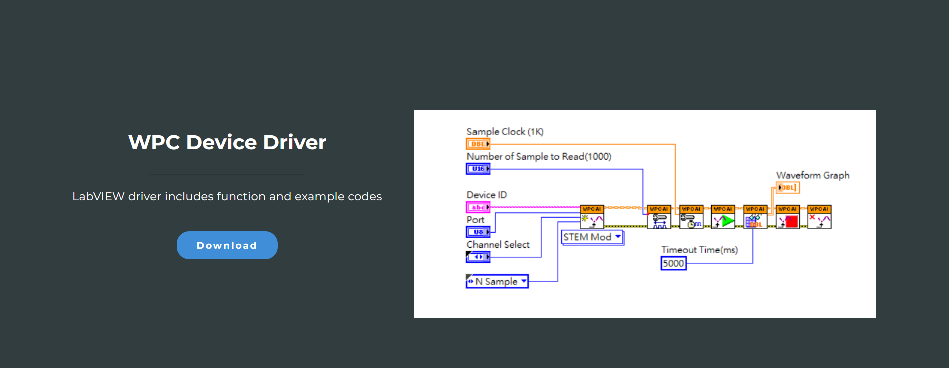 WPC Device Driver is a suite of driver packages designed specifically for LabVIEW, providing comprehensive API support for various WPC products. Through this driver, users can easily control and monitor WPC devices within the LabVIEW environment without having to develop underlying communication protocols from scratch.