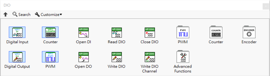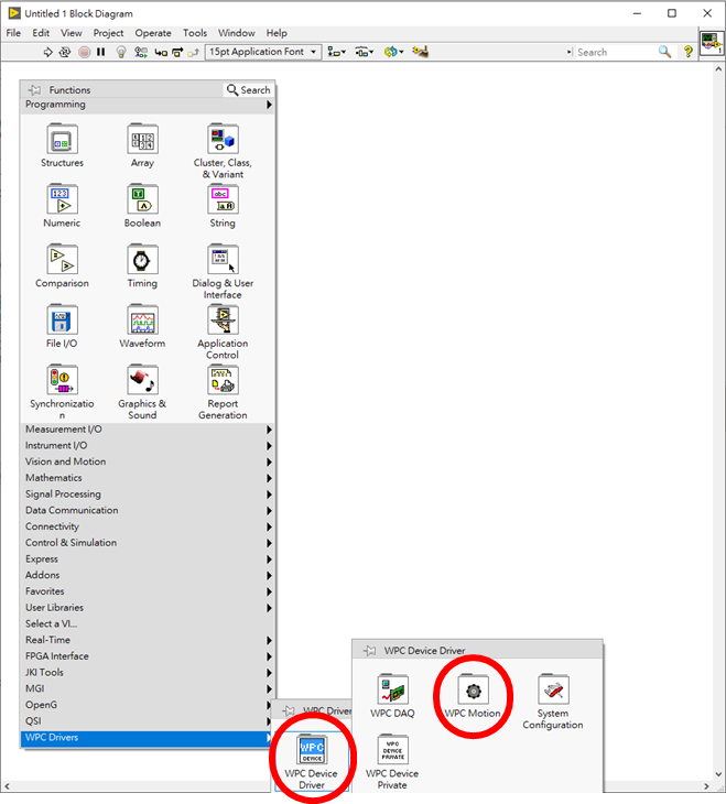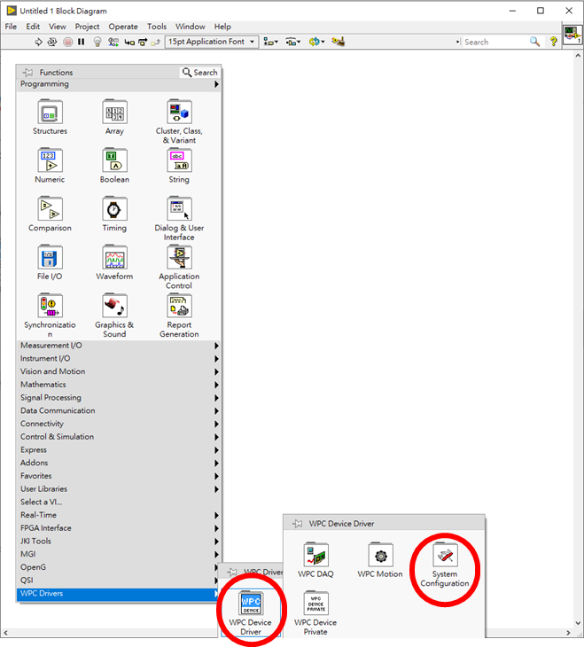 Open LabVIEW, right-click on the Block Diagram to expand the Functions palette. You will see the "WPC Drivers" category, where all WPC drivers are located.