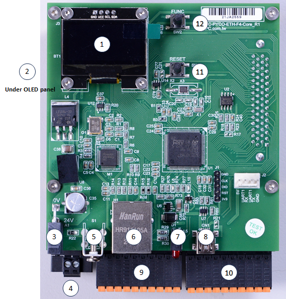- OLED Display: Shows network information, firmware details, serial number, and other functional information.