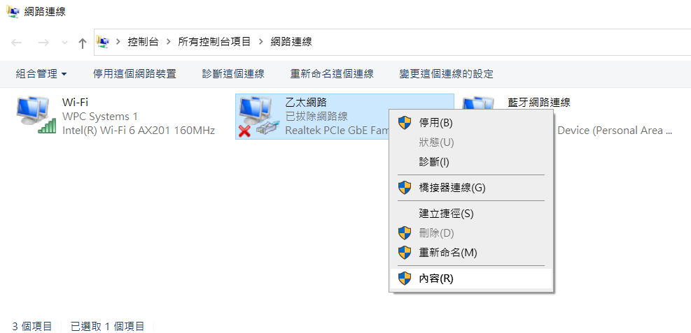 In the "Network Connections" window, find the Ethernet connection you are using, right-click and select "Properties".