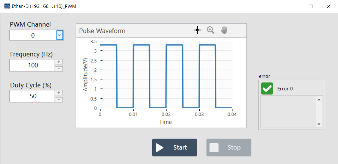 Set the frequency and duty cycle of the PWM output, and control the output using the buttons below: