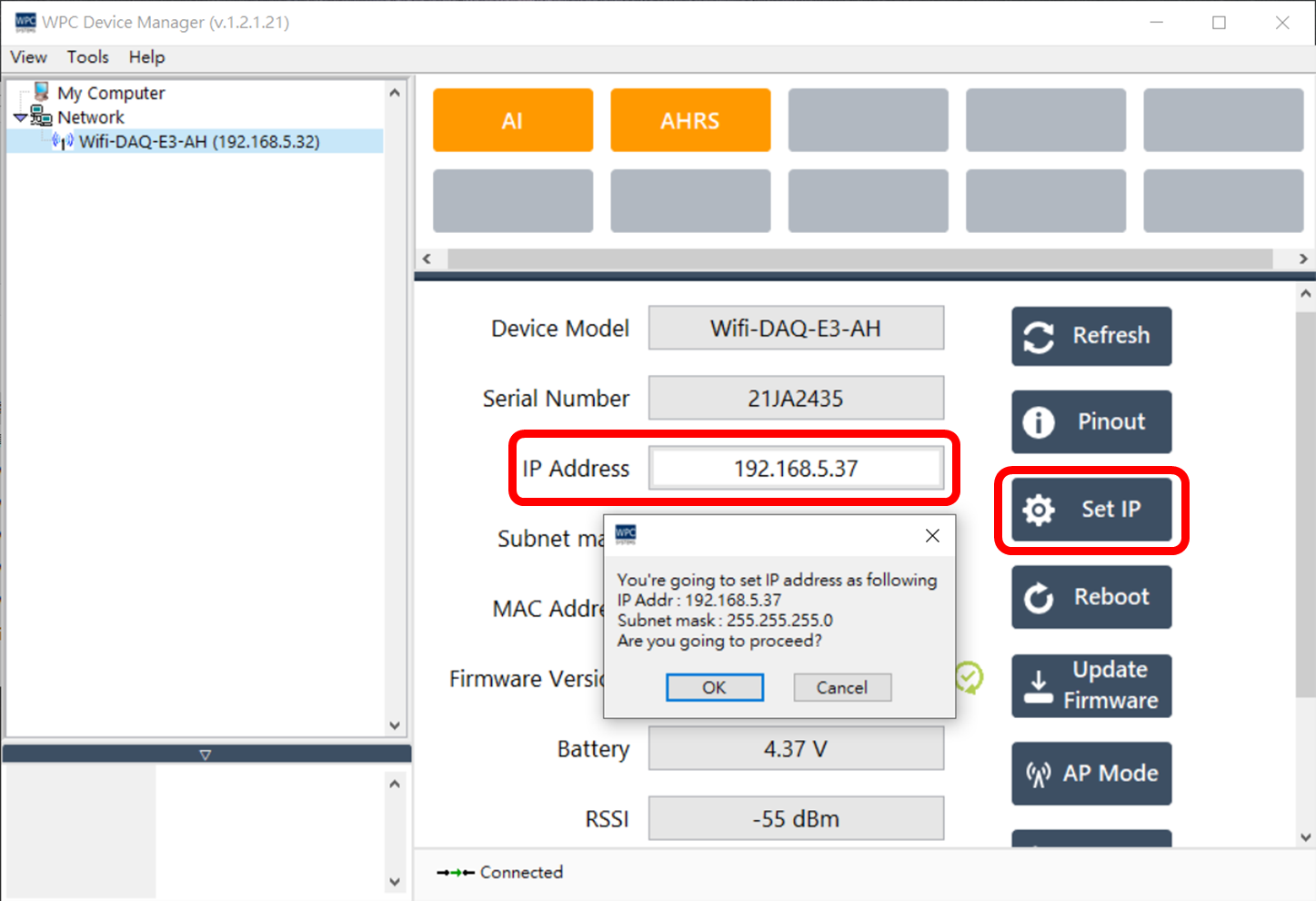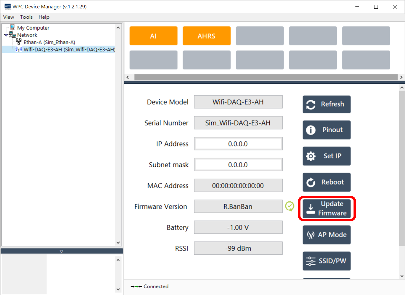 Click the "SSID/PW" button to set the Wi-Fi SSID and password that the device wishes to connect to, or to set the device to AP mode.