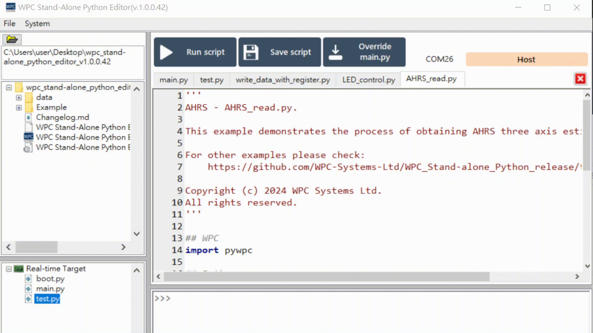 Write or open main.py code in the Editor. Once completed, click the "Run script" button to execute the code; the results will be displayed in the Console.